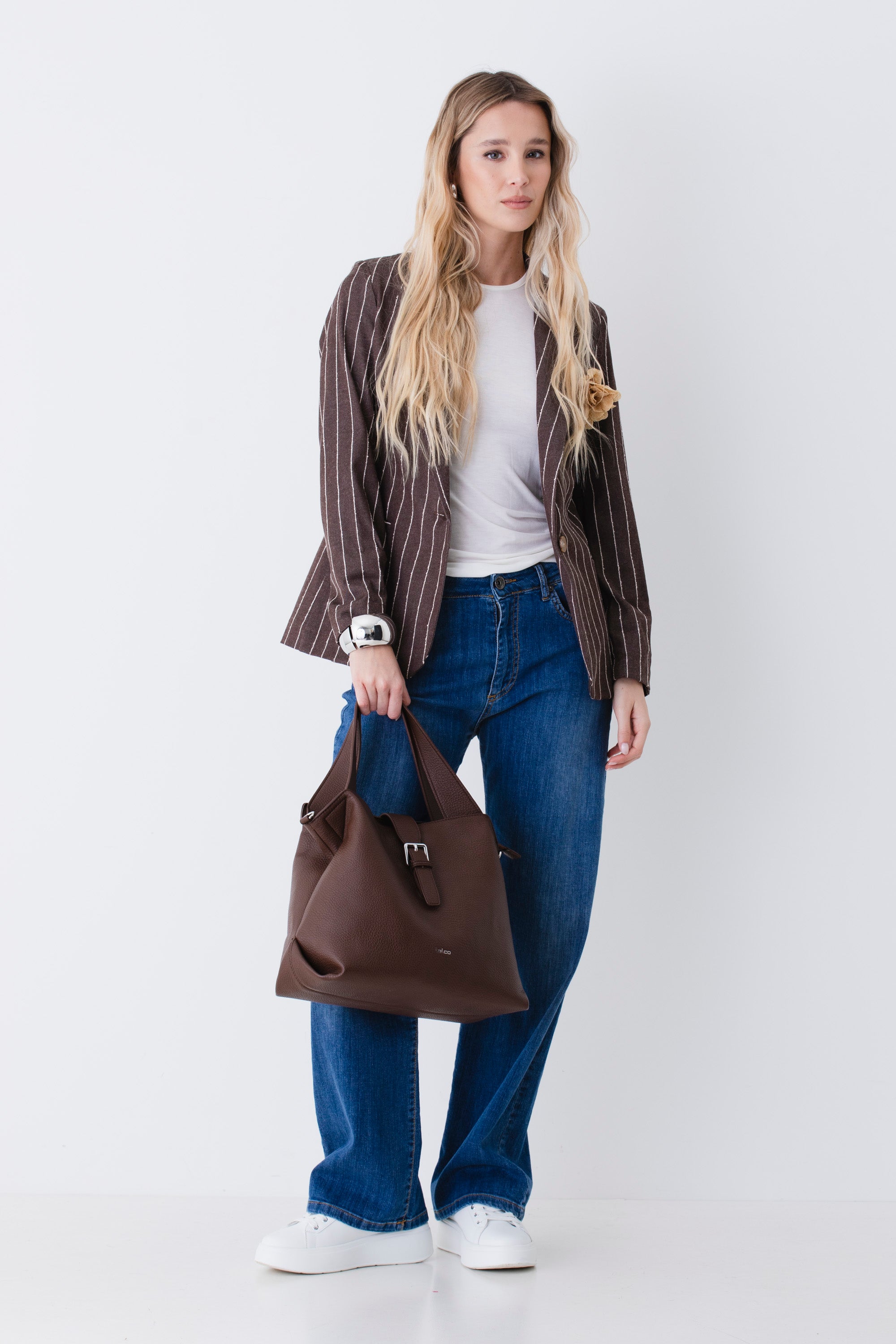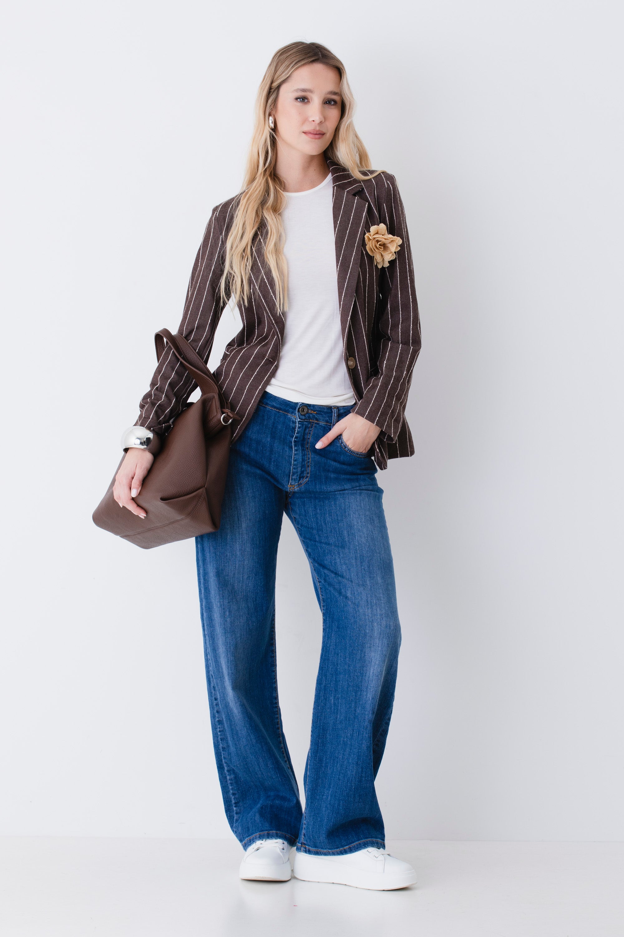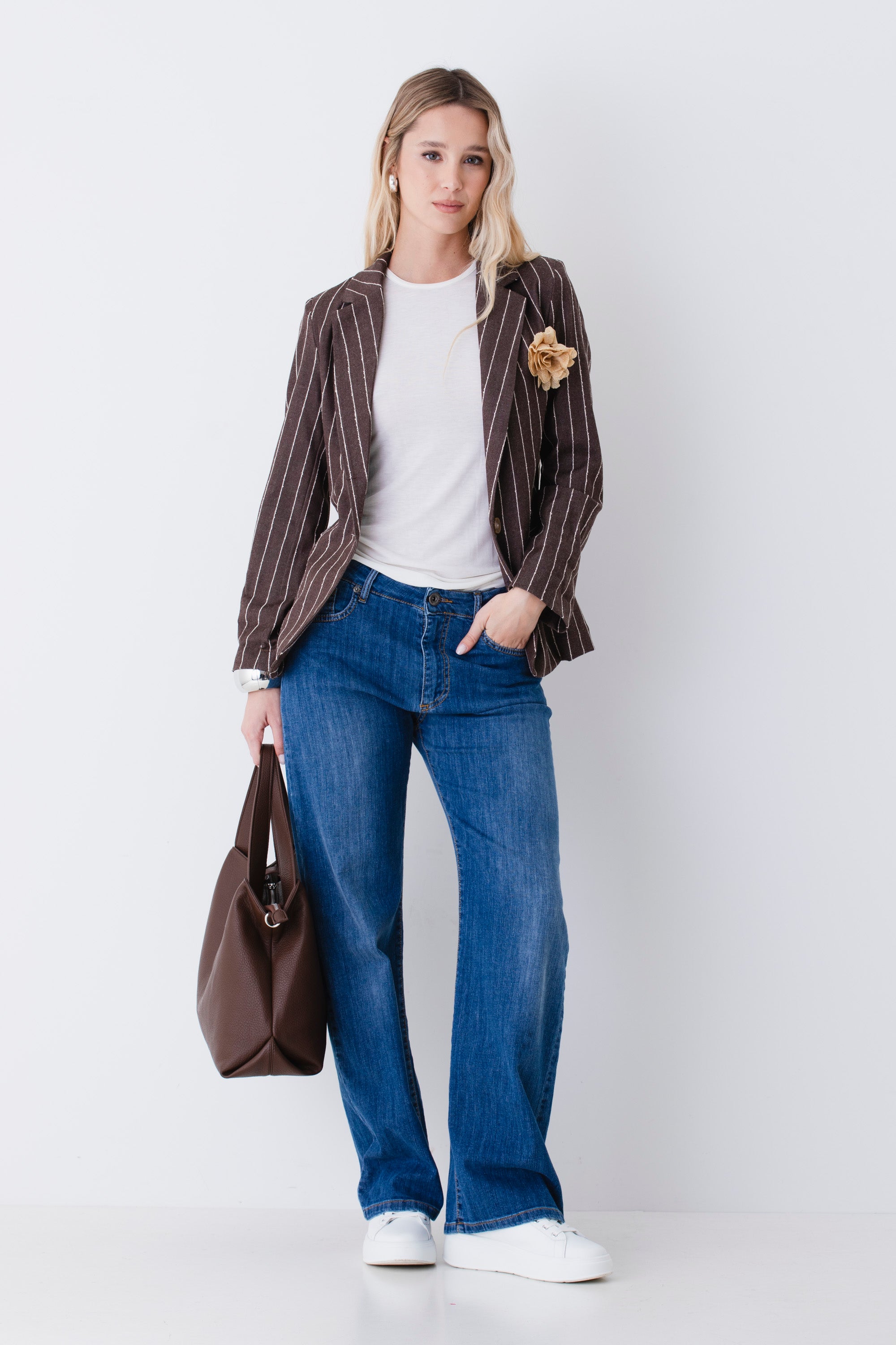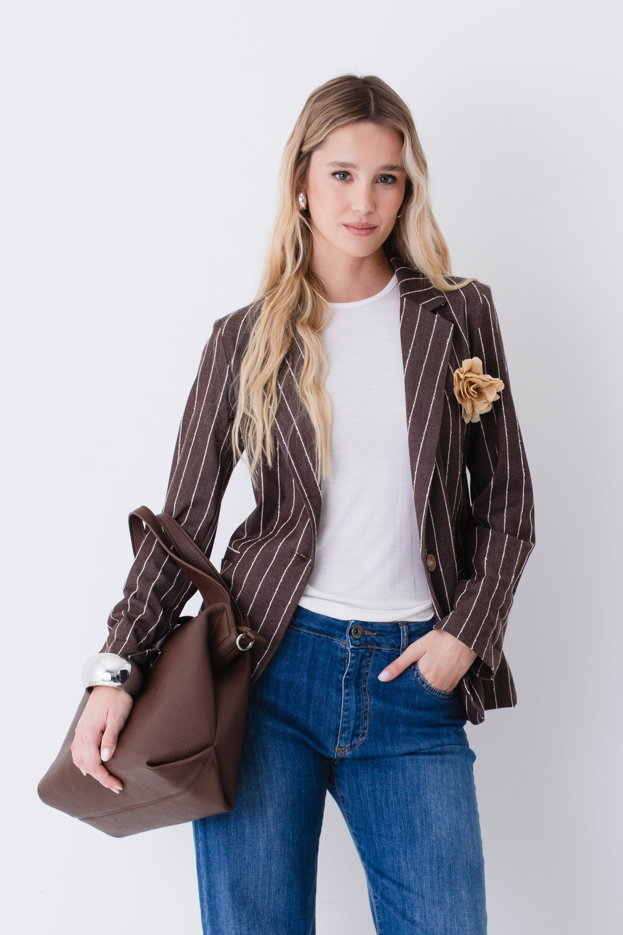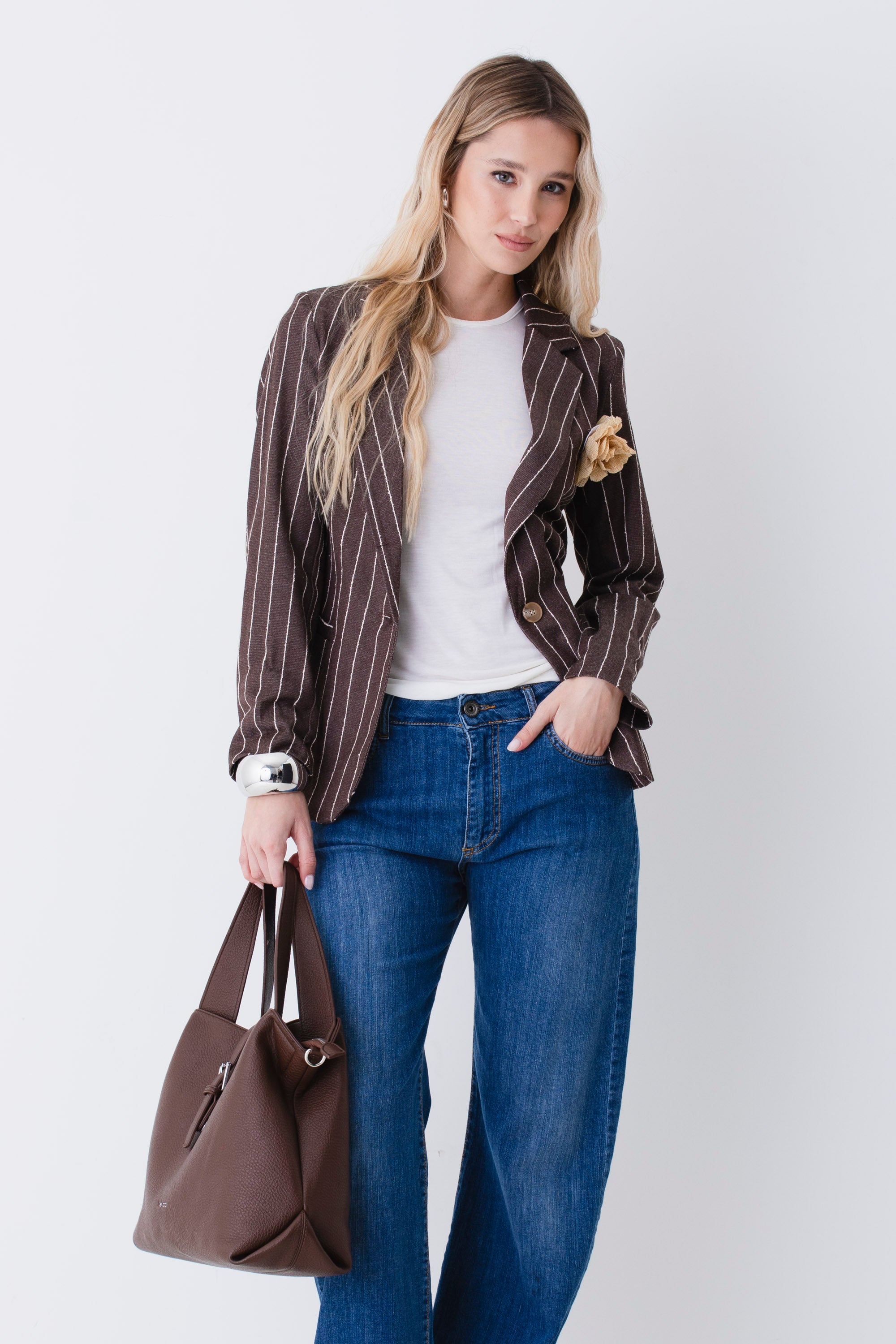 Blazer ad un petto in tessuto gessato di cotone con spilla - PE26