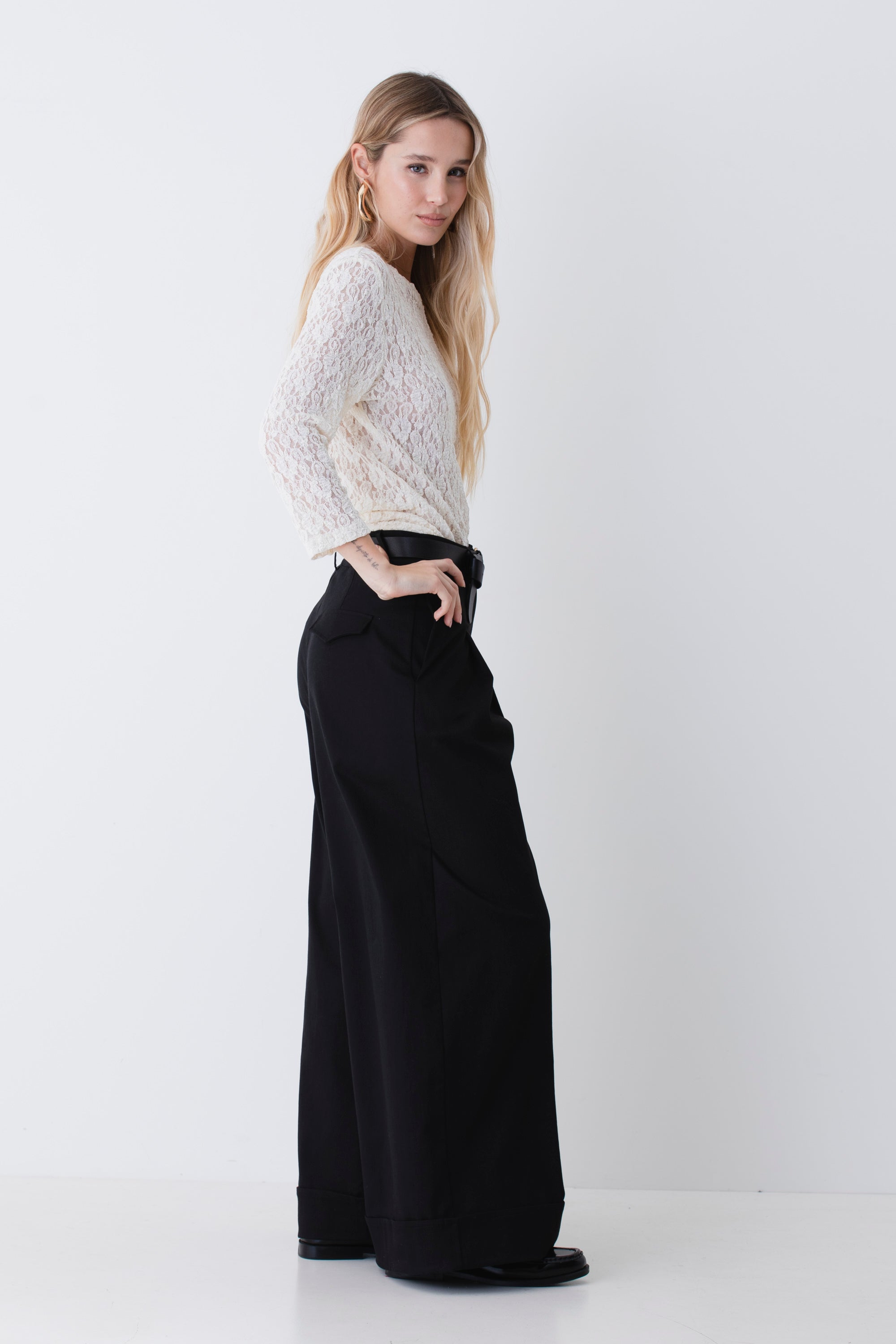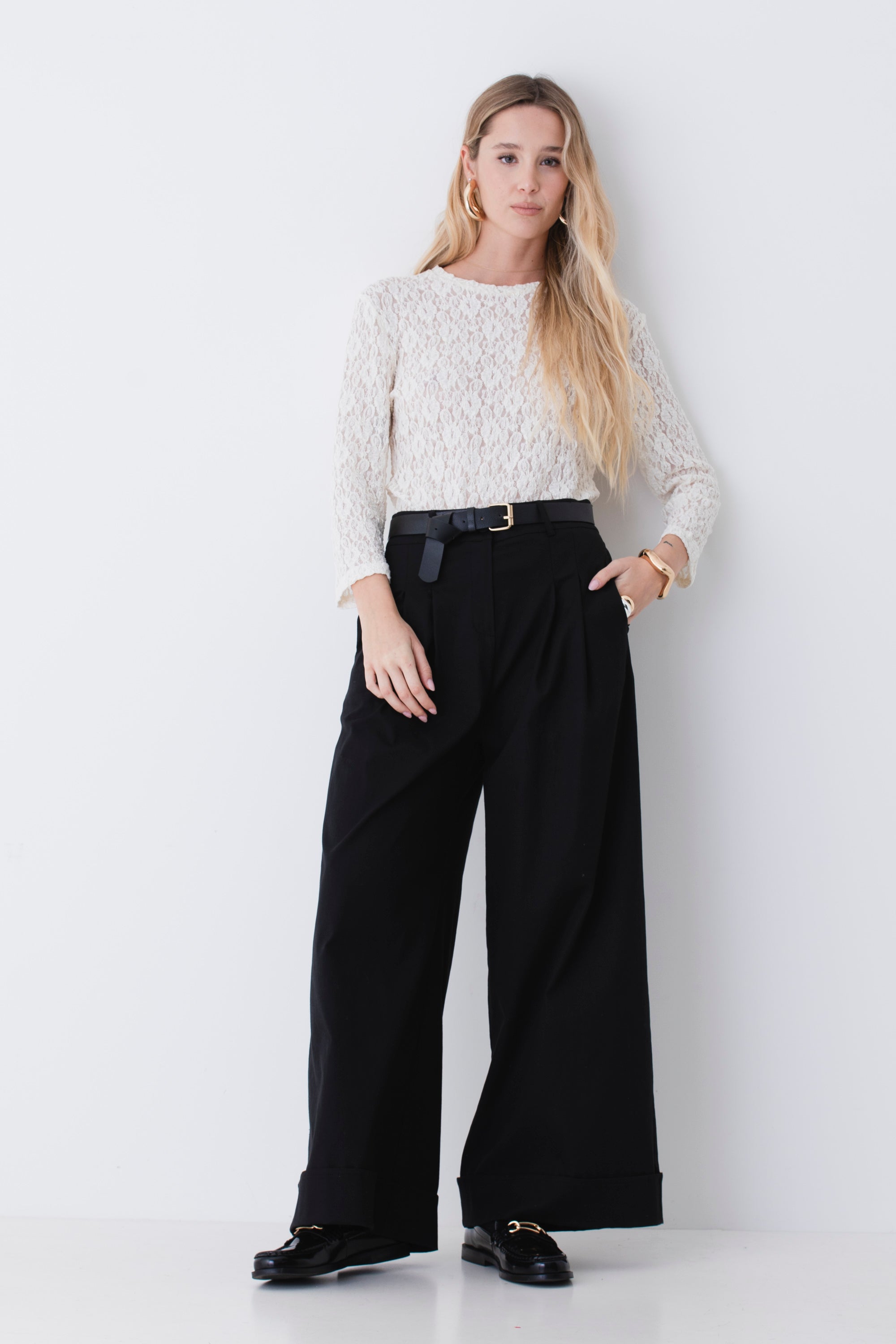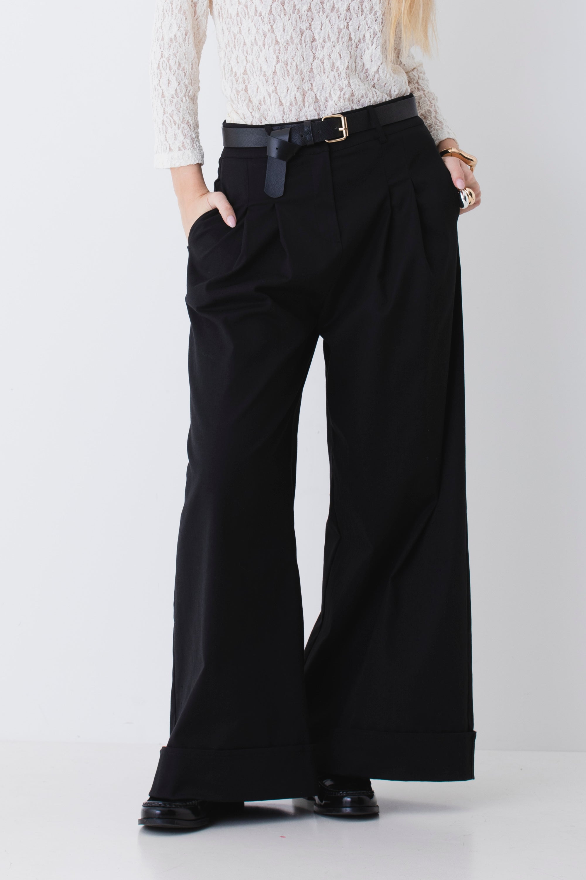 Pantalone palazzo con pinces e risvolto in cotone elasticizzato - PE26
