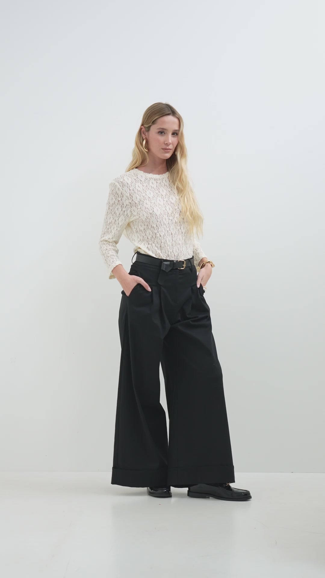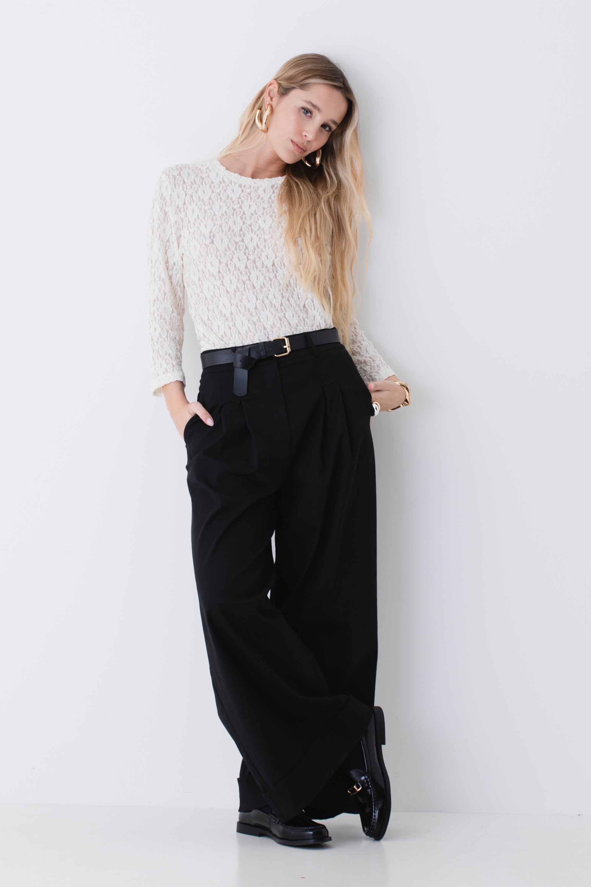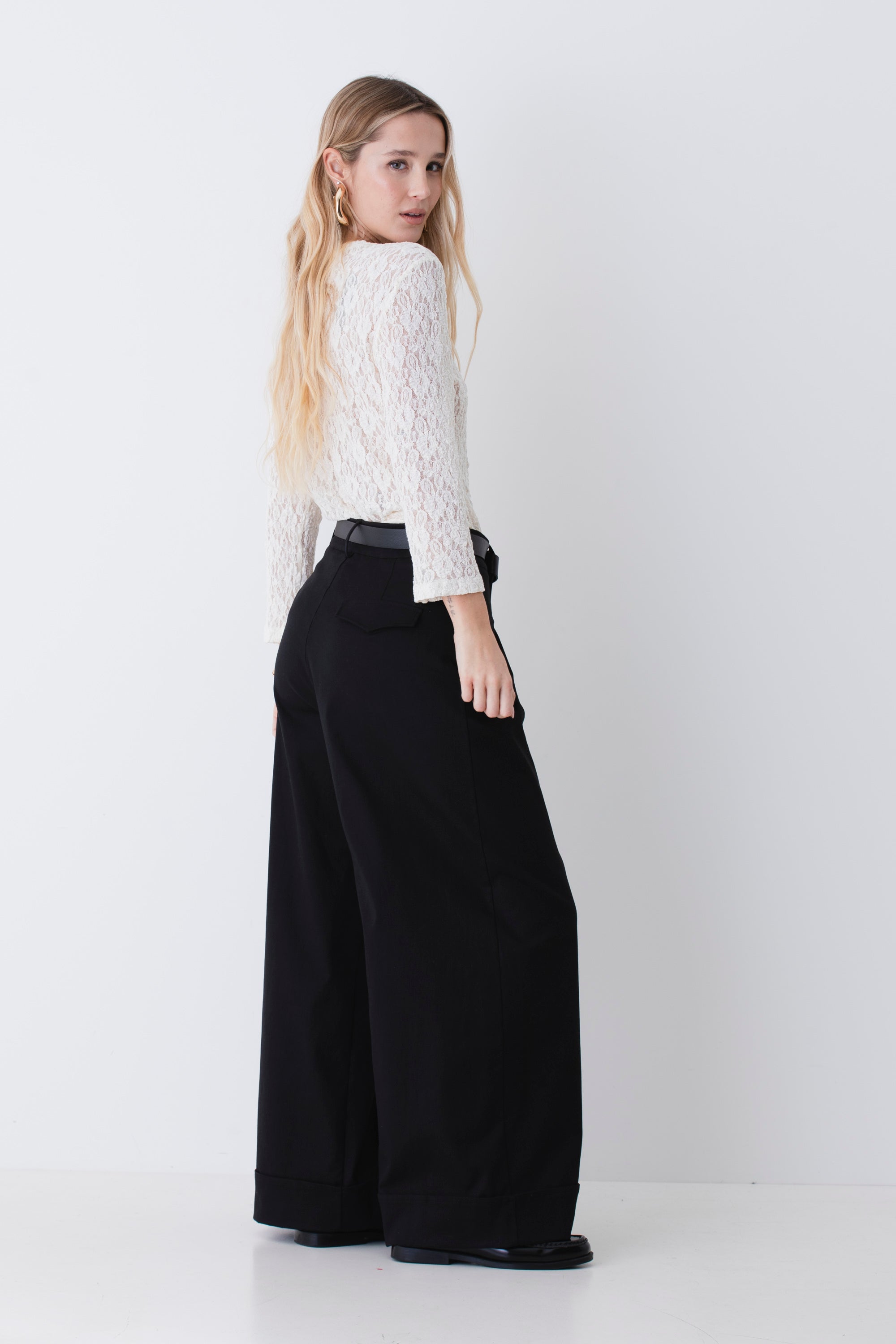 Pantalone palazzo con pinces e risvolto in cotone elasticizzato - PE26