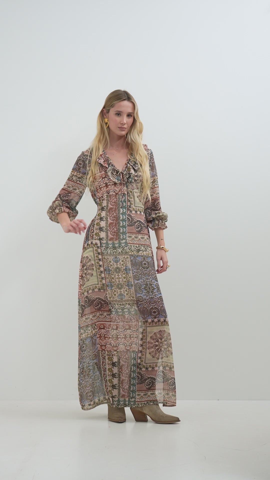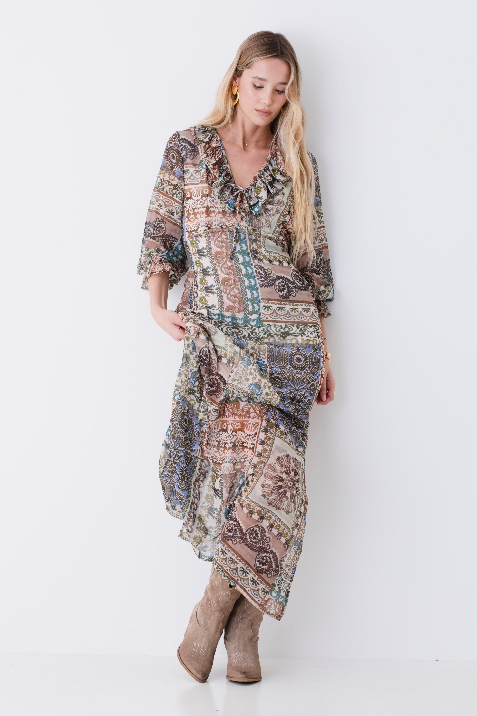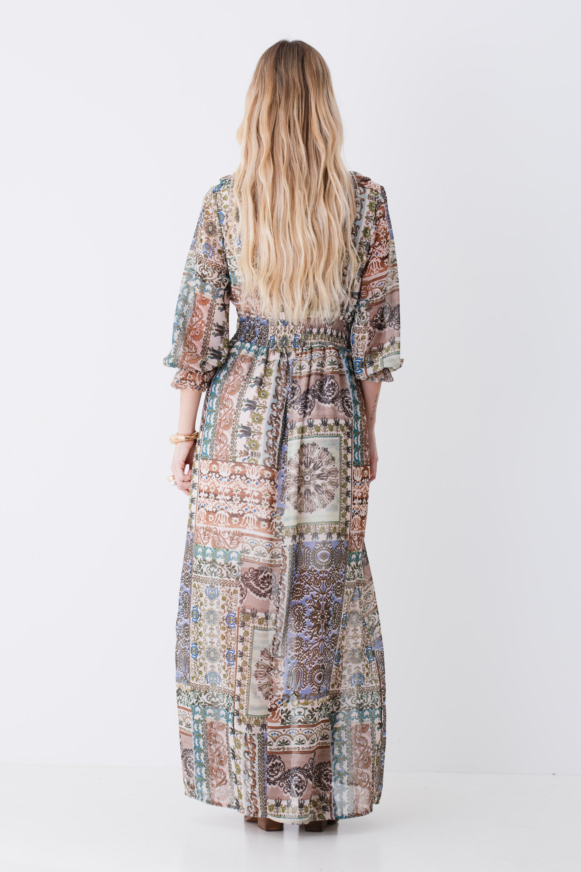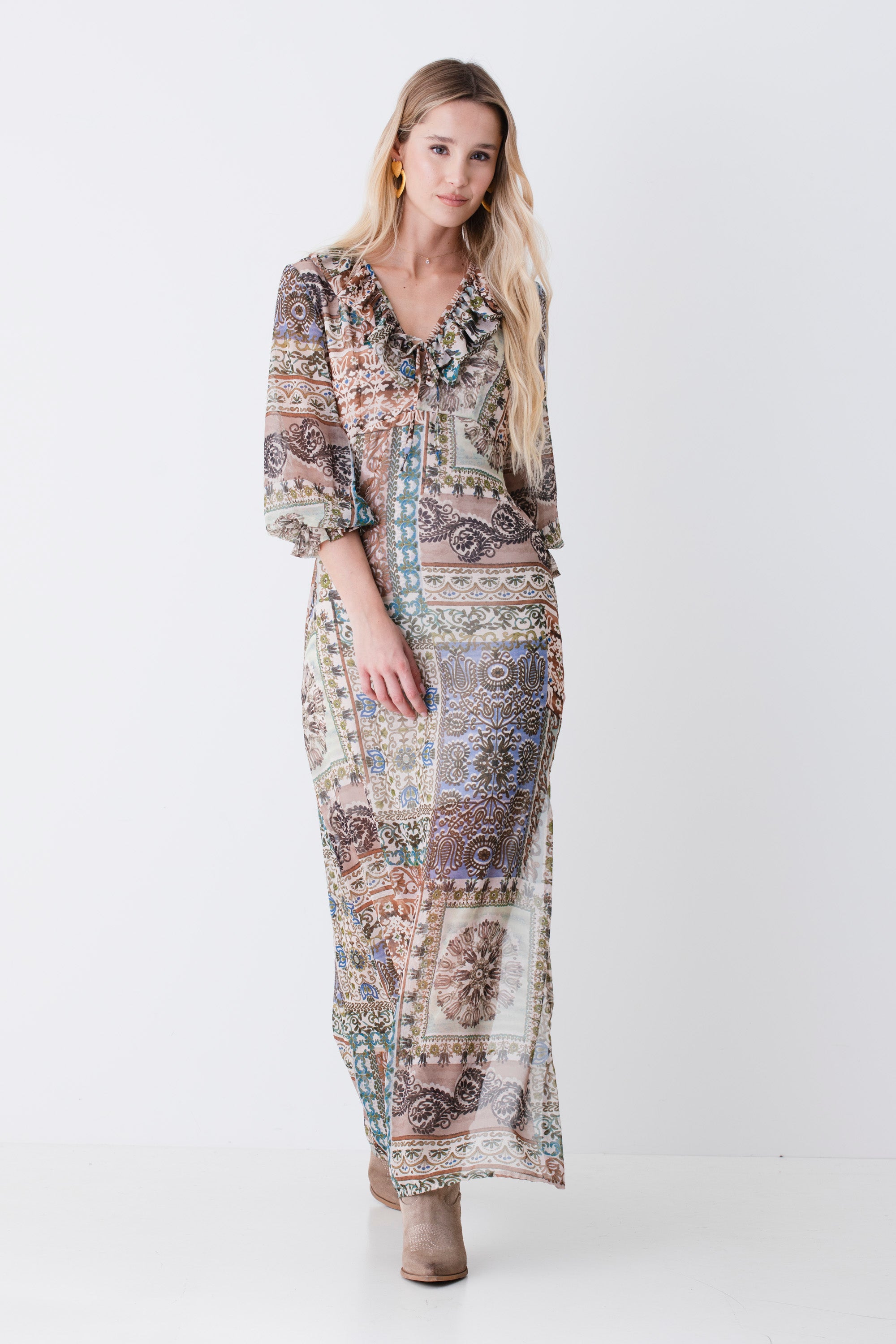 Abito lungo con rouches in georgette fantasia patchwork - PE26